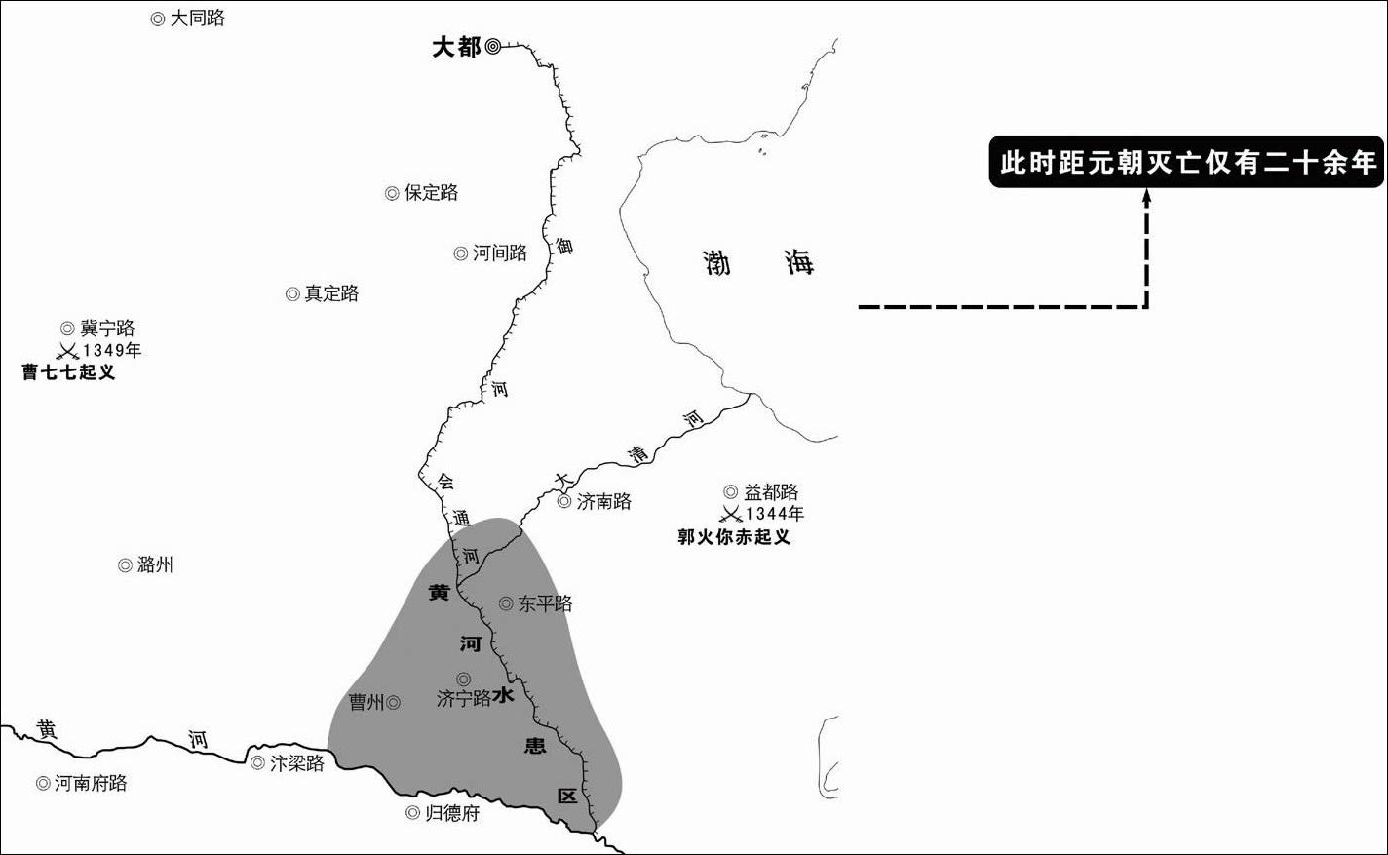 元至正四年(1344)到来了。这一年刚开始,元帝国的头头脑脑们就收到了两个消息。首先是黄河泛滥了,沿岸山东河南几十万人沦为难民。即使不把老百姓当人,但还要防着他们造反,所以修黄河河堤就成为了必须做的事情。