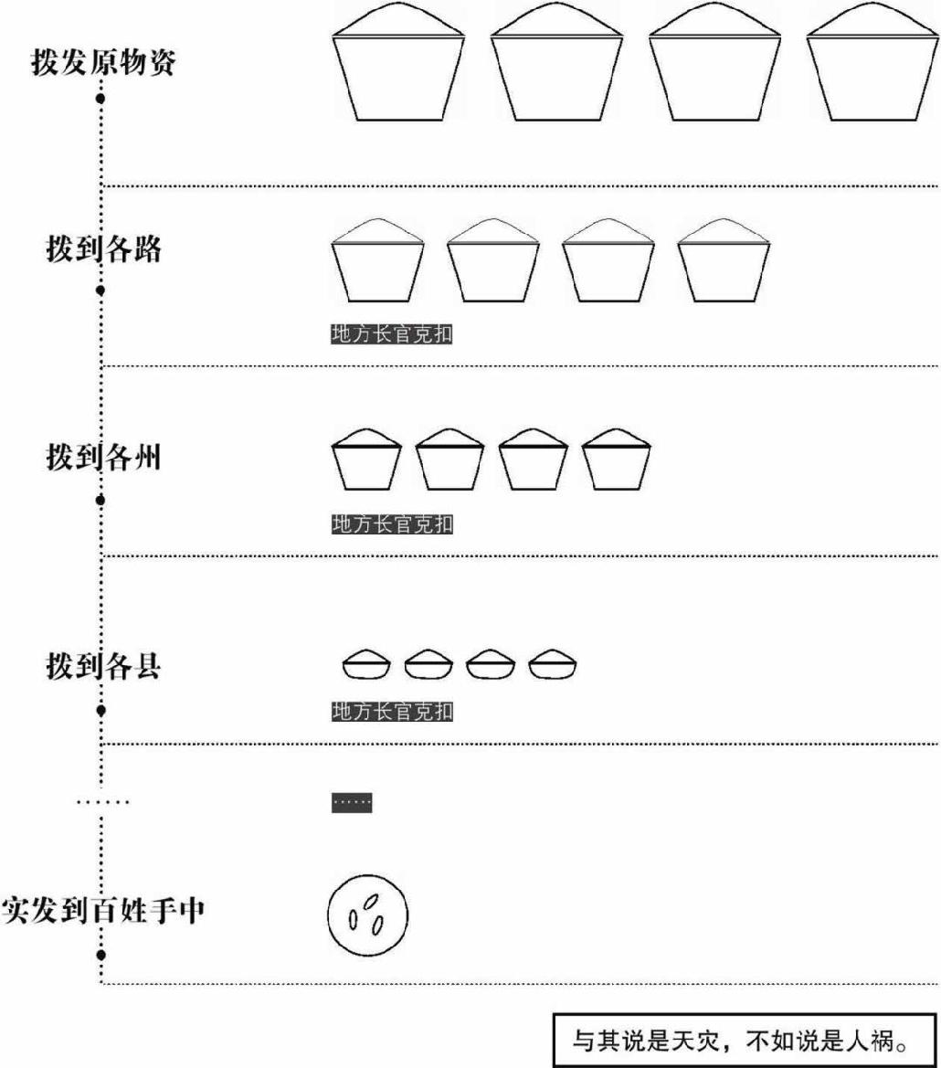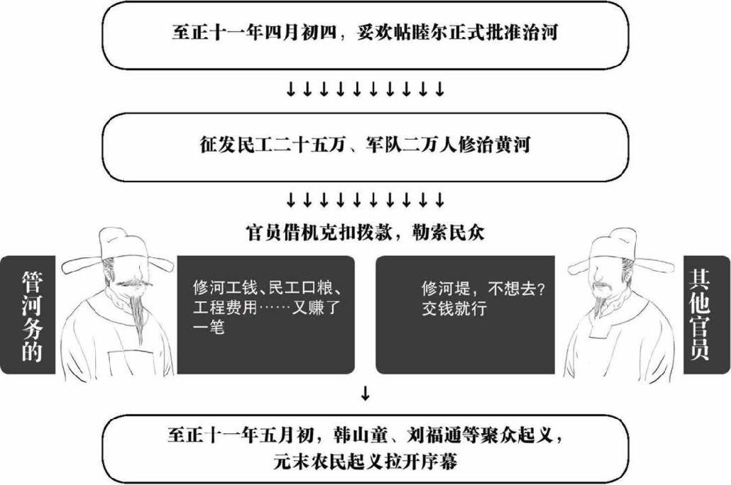 另一个是淮河沿岸遭遇严重瘟疫和旱灾。对于元政府来说,这个比较简单一点,反正饿死病死了就没麻烦了。当然表面功夫还是要做的,皇帝(元顺帝)要下诏赈灾,中书省的高级官员们要联系粮食和银两,当然了,自己趁机拿一点也是可以理解的。赈灾物品拨到各路(元代地方行政单位),地方长官们再留下点,之后是州、县,一层一层下来,到老百姓手中就剩谷壳了。然后地方上的各级官员上书向皇帝表示感谢,照例也要说些感谢天恩的话,并把历史上的尧舜禹汤与皇上比较一下。皇帝看到了报告,深感自己做了大好事,于是就在心中给自己记上一笔。