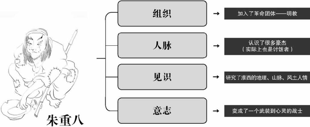 在讨饭的时候,他仔细研究了淮西的地理、山脉、风土人情,他开阔了视野,丰富了见识,认识了很多豪杰(实际上也是讨饭者)。此时,他还有了自己的宗教信仰——明教,他相信当黑暗笼罩大地的时候,伟大的弥勒佛一定会降世的。其实就他的身世遭遇来说,他是不是真的相信弥勒倒是很难说的,我们有理由相信,他心中真正的弥勒是他自己。