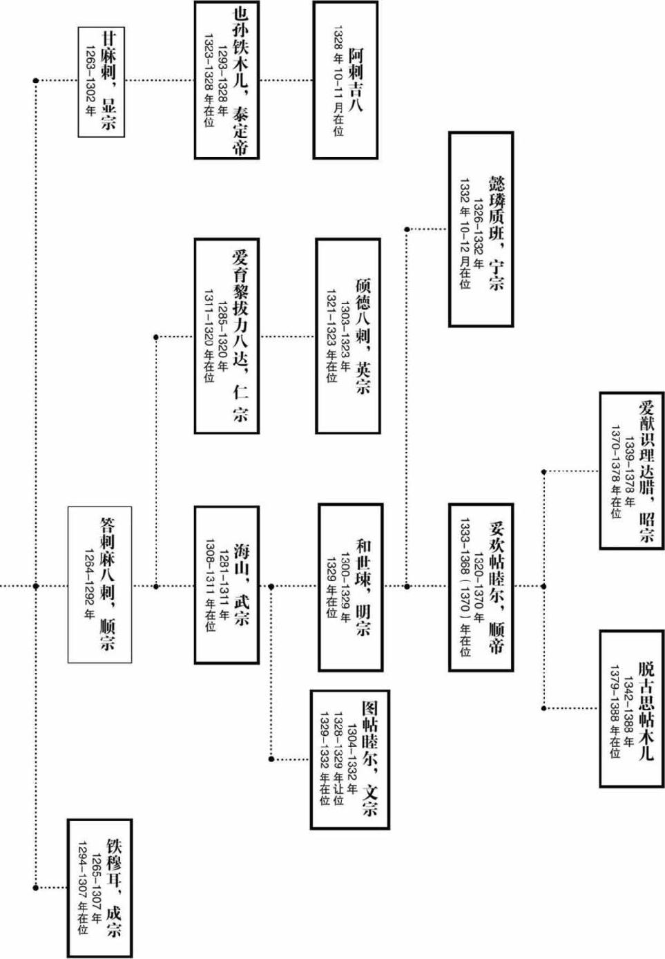 1328~1333,这是元的多事之秋。1328年,也孙铁木儿(泰定帝)病死,他刚九虚岁的儿子阿剌吉八(天顺帝),即位不到一个月就被堂叔图帖睦尔(文宗)赶下了台。图帖睦尔继任后怕亲哥哥和世㻋(明宗)造反,便借禅让的名义将和世捧上龙椅又将其毒杀。在接下来的三年任期中,图帖睦尔不断梦见哥哥毒发的样子,于是吩咐他死后由哥哥的儿子懿质班(宁宗)即位,没料到这个七岁的小孩即位一个月就病死了。最后,就由和世㻋的另一个儿子——被亲爹流放荒岛、被朱元璋称做“顺帝”的妥欢帖睦尔接掌皇位。