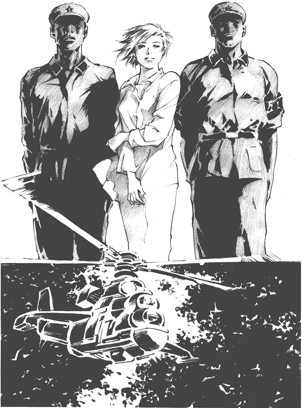 大楼顶上出现了一个娇小的身影,那个美丽的女孩子挥动着一面“四.二八”的大旗,她的出现立刻招来了一阵杂乱的枪声,射击的武器五花八门,有陈旧的美式卡宾枪、捷克式机枪和三八大盖,也有崭新的制式步枪和冲锋枪——后者是在“八月社论”发表之后从军队中偷抢来1的——连同那些梭标和大刀等冷兵器,构成了一部浓缩的近现代史……“四.二八”的人在前面多次玩过这个游戏,在楼顶上站出来的人,除了挥舞旗帜外,有时还用喇叭筒喊口号或向下撒传单,每次他们都能在弹雨中全身而退,为自己挣到了崇高的荣誉。这次出来的女孩儿显然也相信自己还有那样的幸运她挥舞着战旗,挥动着自己燃烧的青春,敌人将在这火焰中化为灰烬,理想世界明天就会在她那沸腾的热血中诞生……她陶醉在这鲜红灿烂的梦幻中,直到被一颗步枪子弹洞穿了胸膛,十五岁少女的胸膛是那么柔嫩,那颗子弹穿过后基本上没有减速,在她身后的空中发出一声啾鸣。年轻的红卫兵同她的旗帜一起从楼顶落下,她那轻盈的身体落得甚至比旗帜还慢,仿佛小鸟眷恋着天空。
